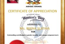 अंतरराष्ट्रीय महिला दिवस पर पत्रकार रीना स्लाथिया ज्यूडिशियल काउंसिल द्वारा सम्मानित