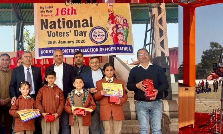 कठुआ, 24 जनवरी: राष्ट्रीय मतदाता दिवस के उपलक्ष्य में कठुआ प्रशासन द्वारा जिला खेल स्टेडियम, कठुआ में ओपन माइक कार्यक्रम का आयोजन किया गया। कार्यक्रम का उद्देश्य लोकतांत्रिक मूल्यों को बढ़ावा देना और लोगों, खासकर युवाओं, को मतदान के प्रति जागरूक करना था।