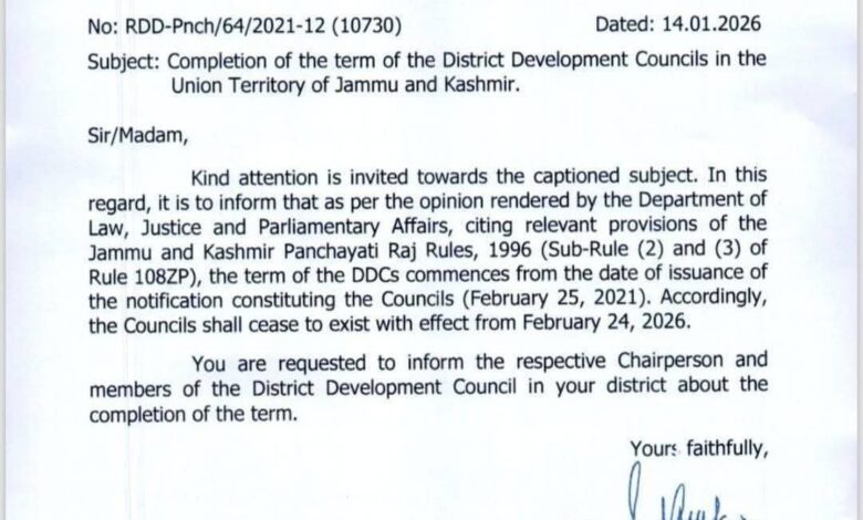 जम्मू,  जम्मू-कश्मीर सरकार ने जिला विकास परिषदों (डीडीसी) के कार्यकाल की समाप्ति को लेकर आधिकारिक आदेश जारी किया है। ग्रामीण विकास एवं पंचायती राज विभाग द्वारा जारी पत्र में बताया गया है कि केंद्र शासित प्रदेश की सभी जिला विकास परिषदों का कार्यकाल 24 फरवरी 2026 को समाप्त हो जाएगा।
